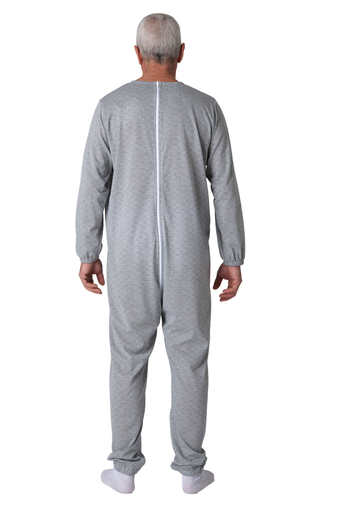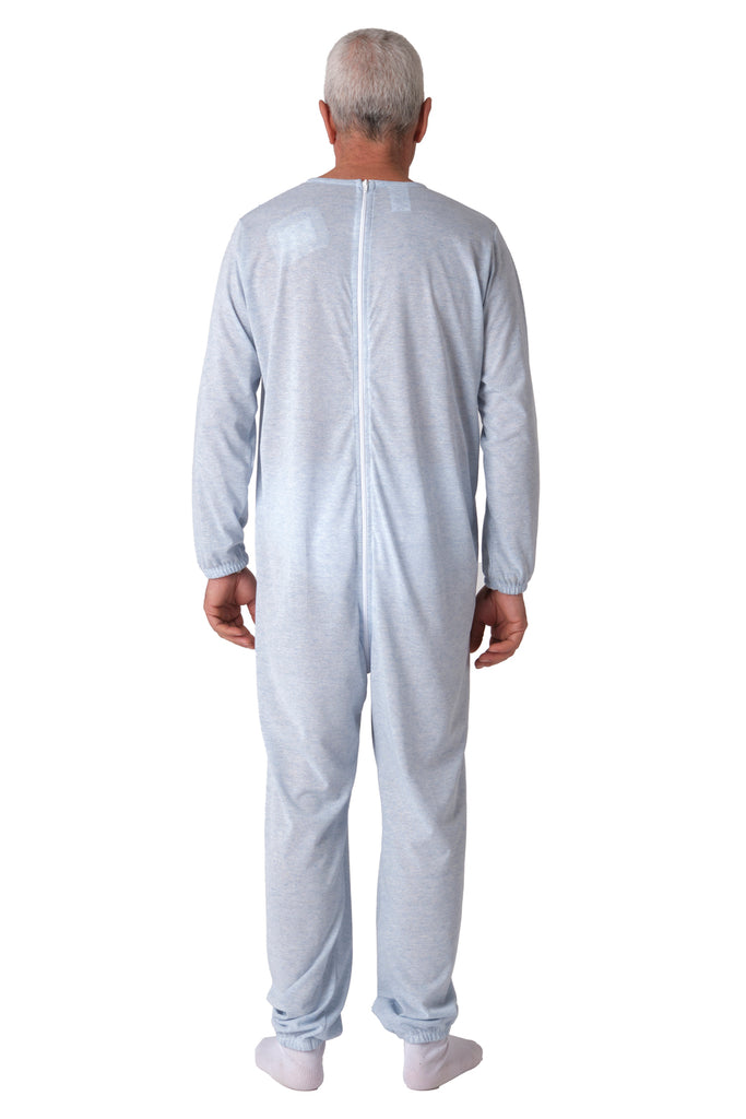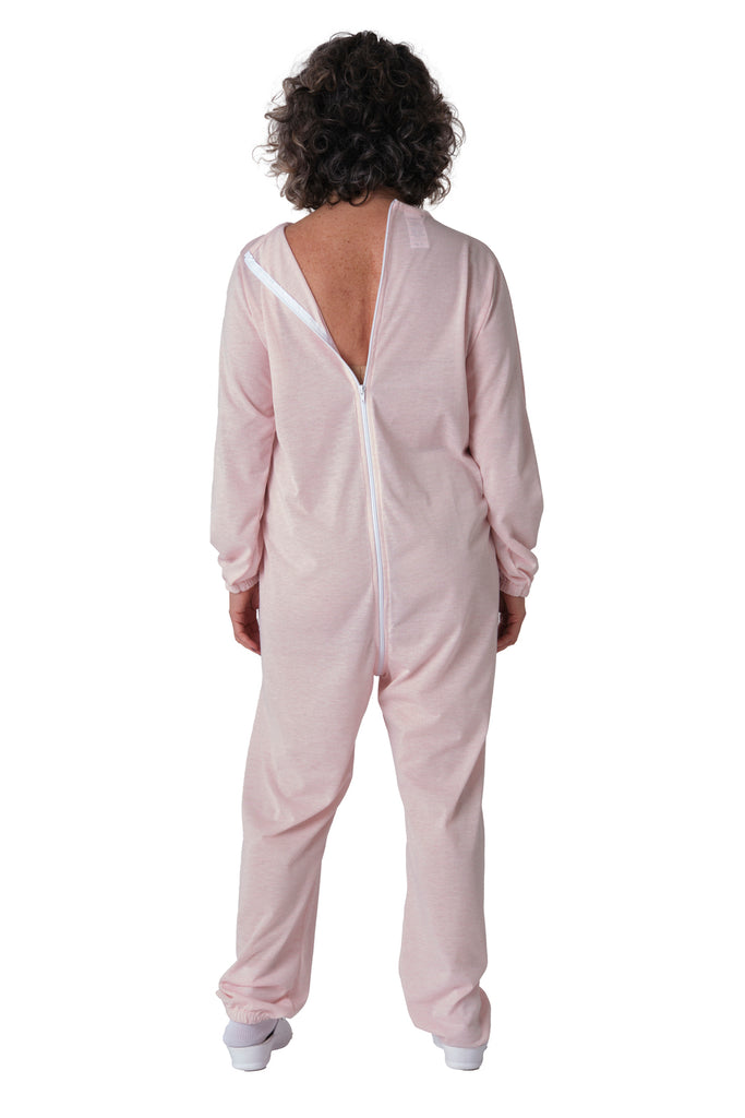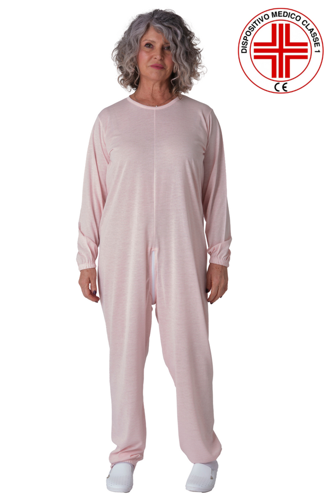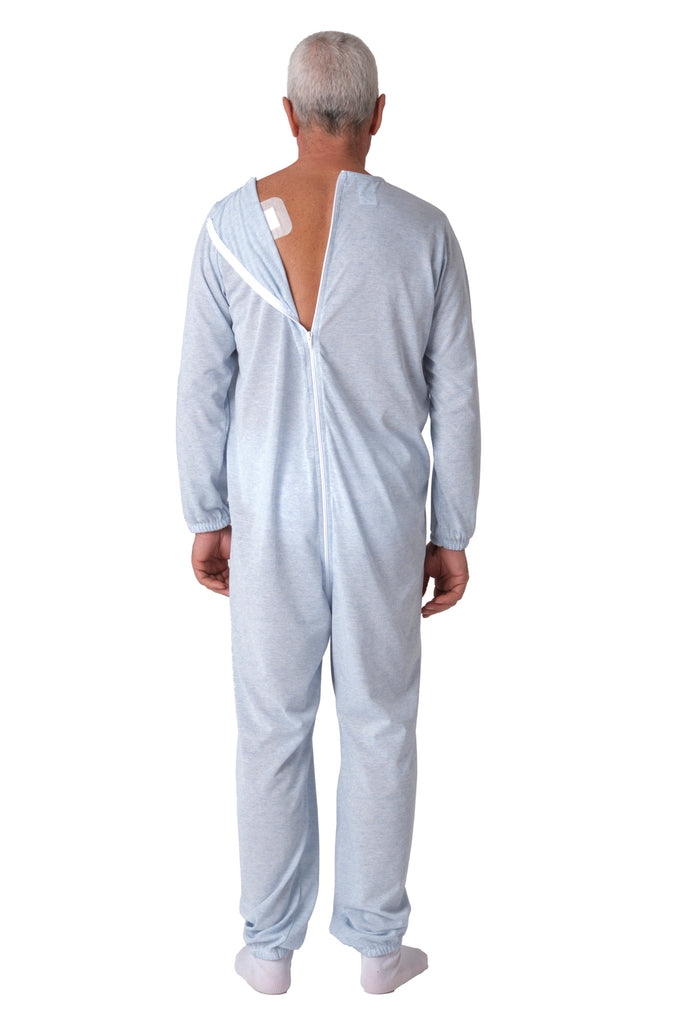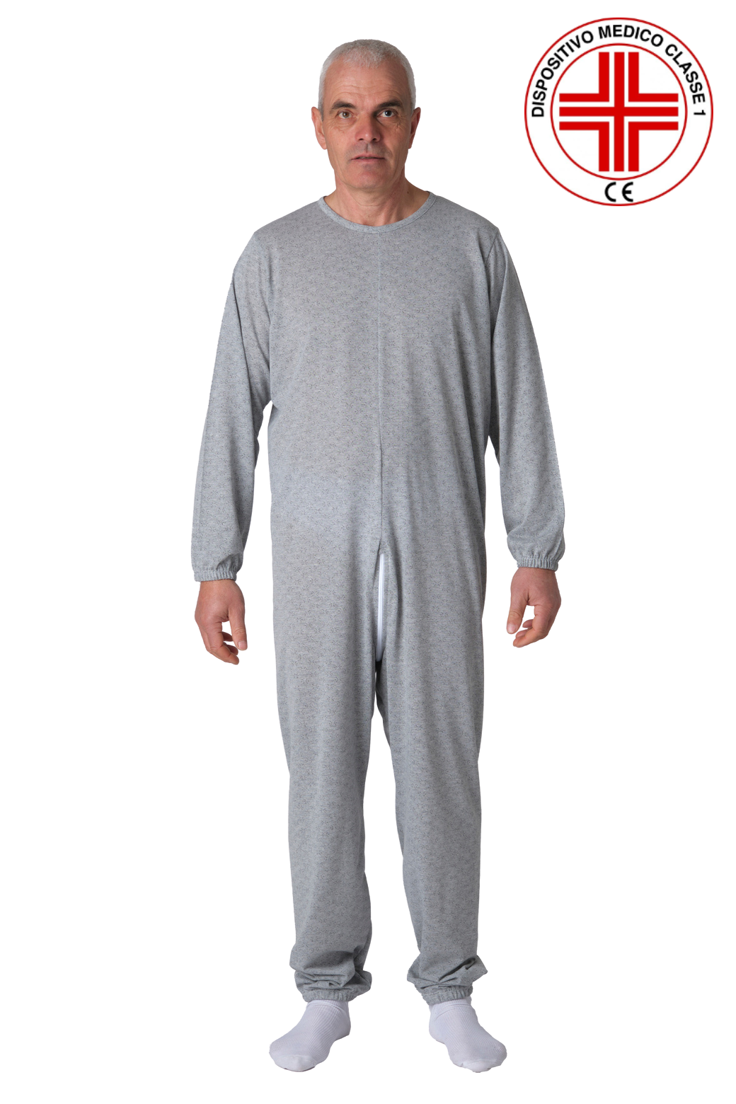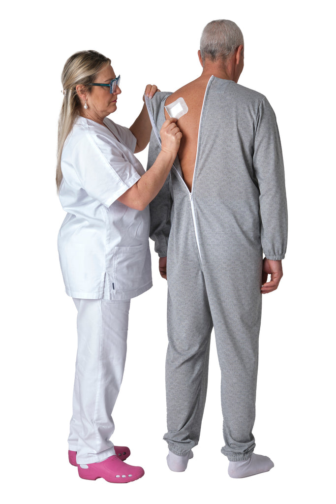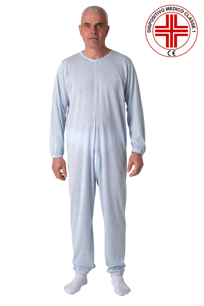 Grazie alla cerniera unica posteriore che si estende fino al punto vita, il pigiama facilita il lavoro degli operatori sanitari durante il cambio degli ausili e impedisce al paziente di rimuovere accidentalmente il capo.