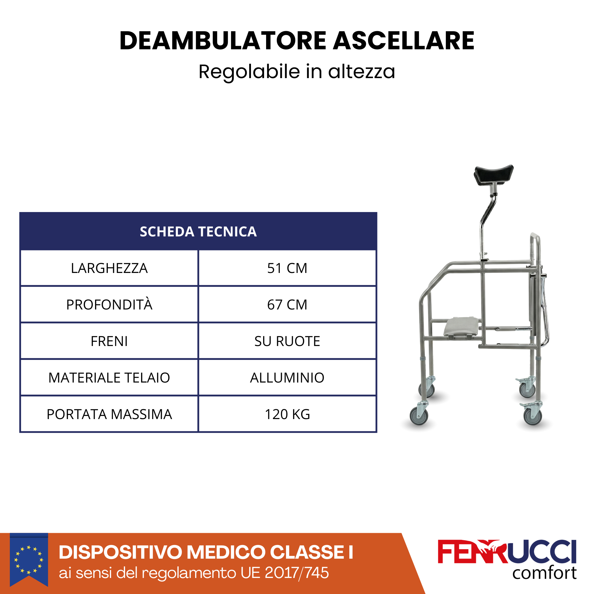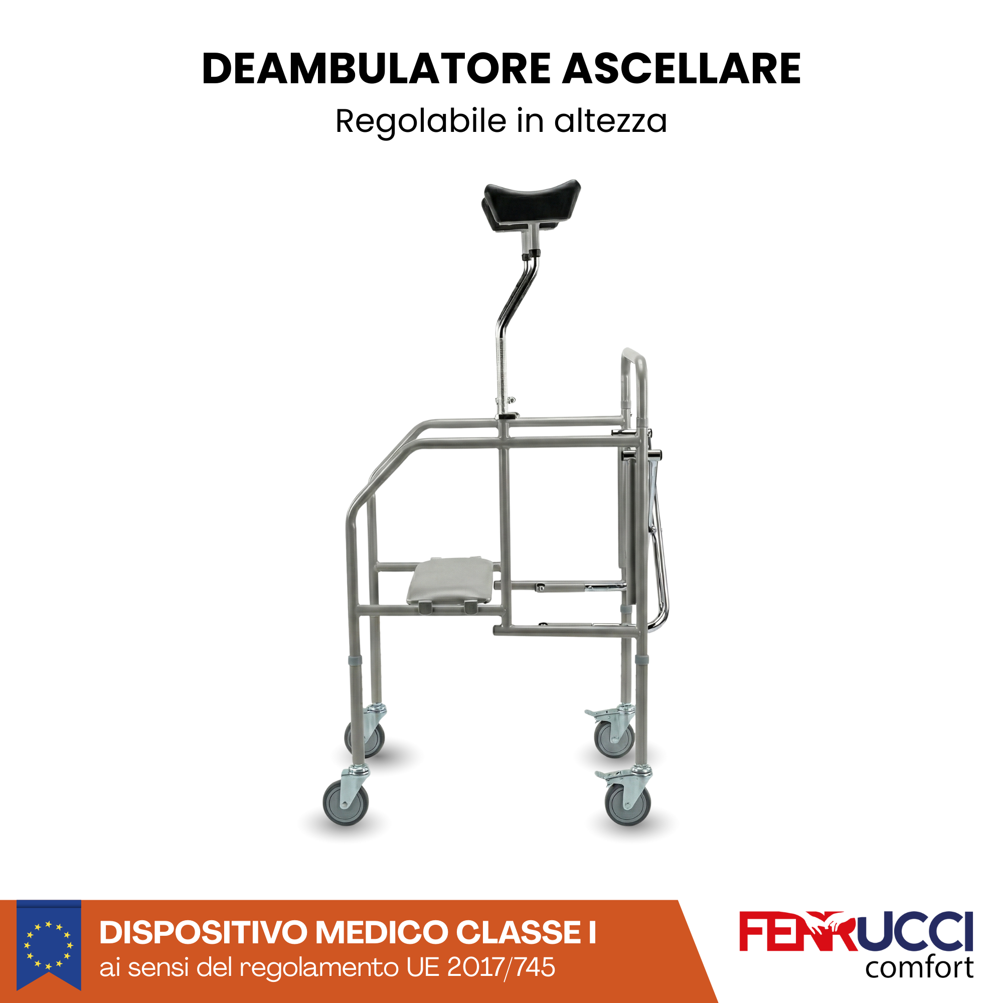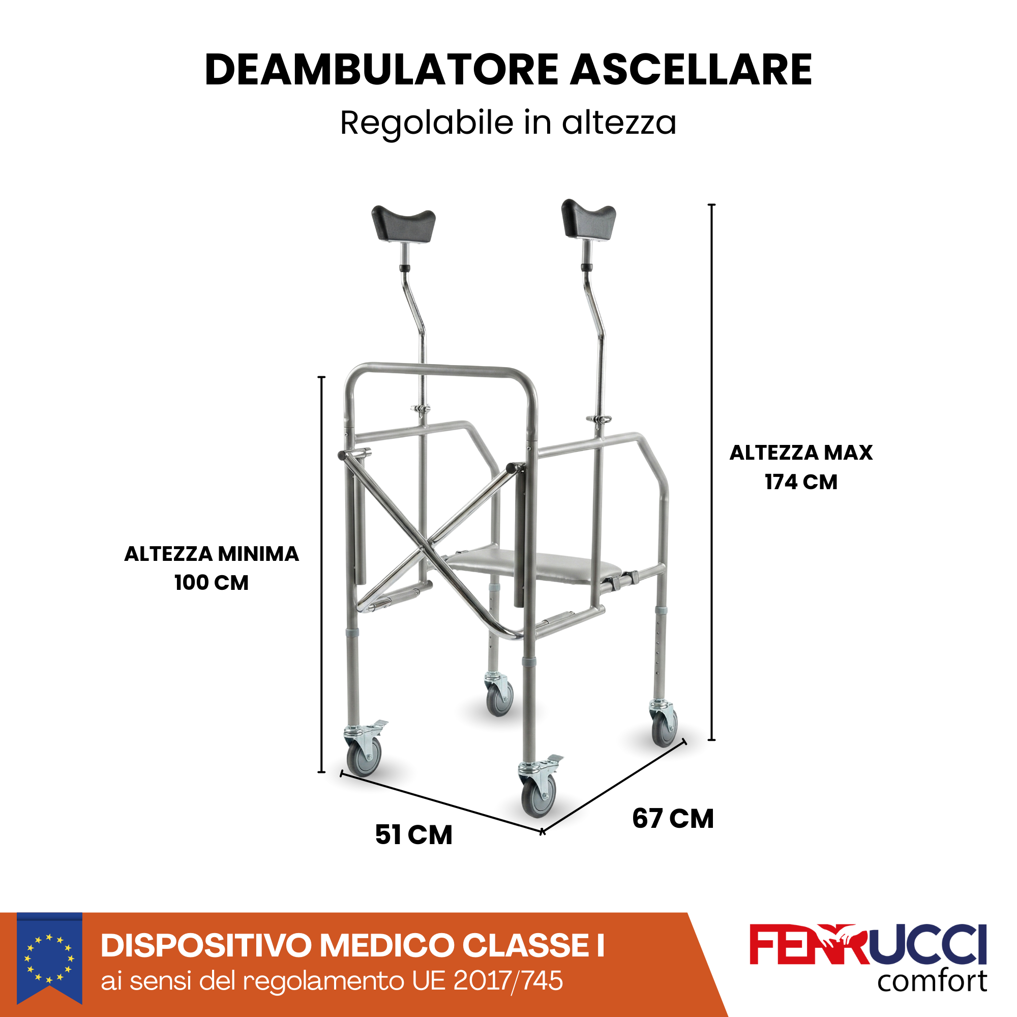 Deambulatore ascellare pieghevole Ferrucci Comfort: la soluzione ideale per chi desidera mantenere autonomia e indipendenza nei movimenti quotidiani. Dotato di altezza completamente regolabile su più livelli e supporti ascellari adattabili, si adatta perfettamente alla morfologia di ogni utilizzatore. Il sedile imbottito integrato offre un punto di riposo comodo durante le pause, mentre la struttura pieghevole facilita il trasporto e lo stoccaggio.