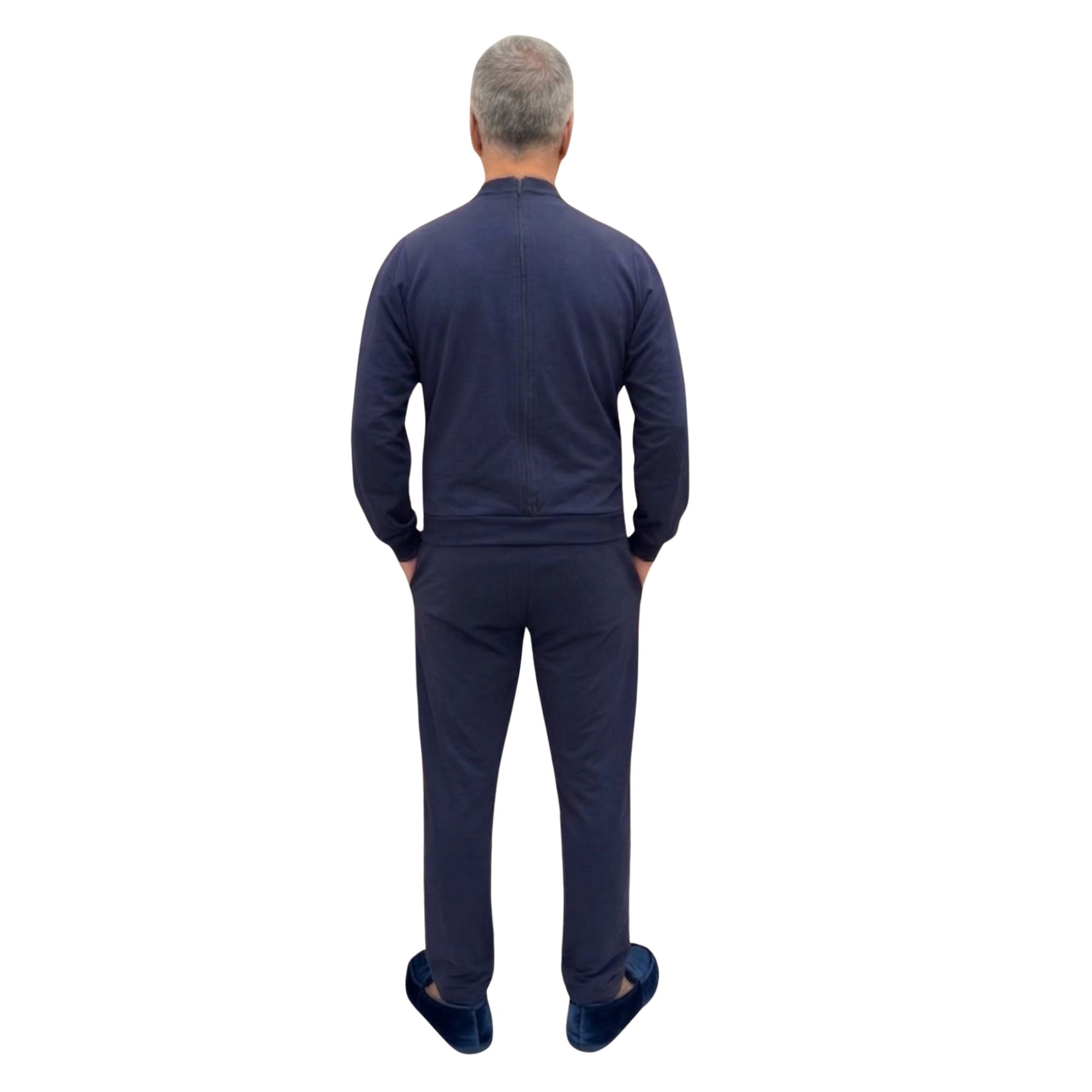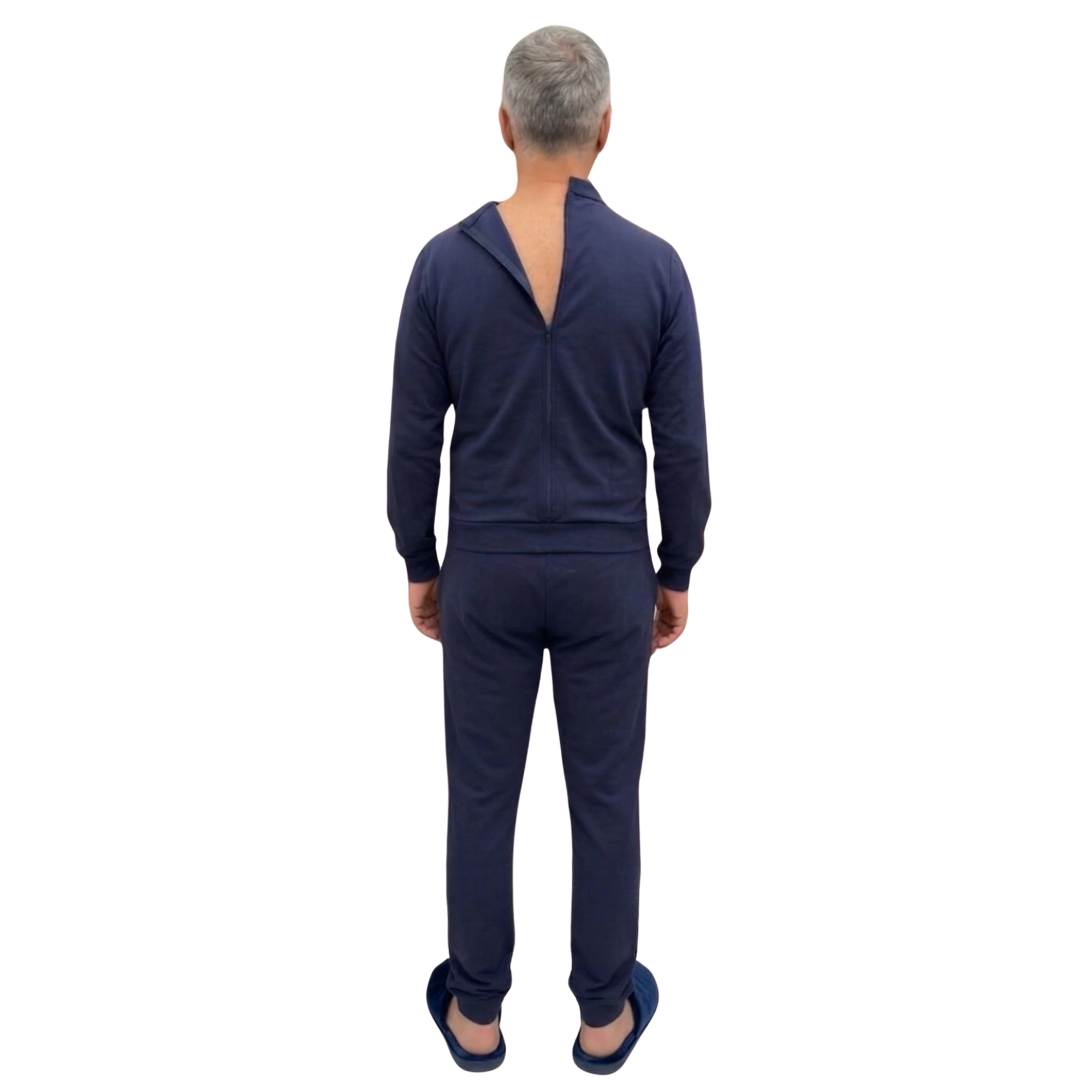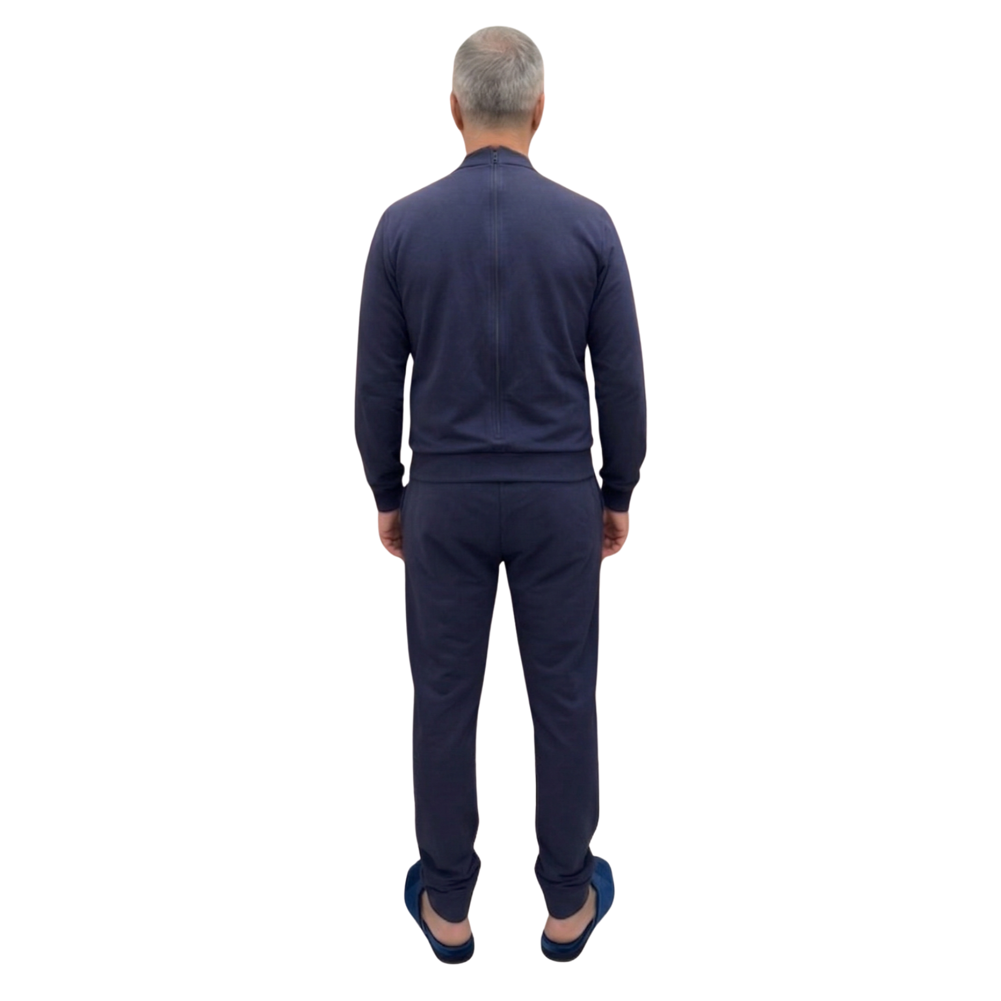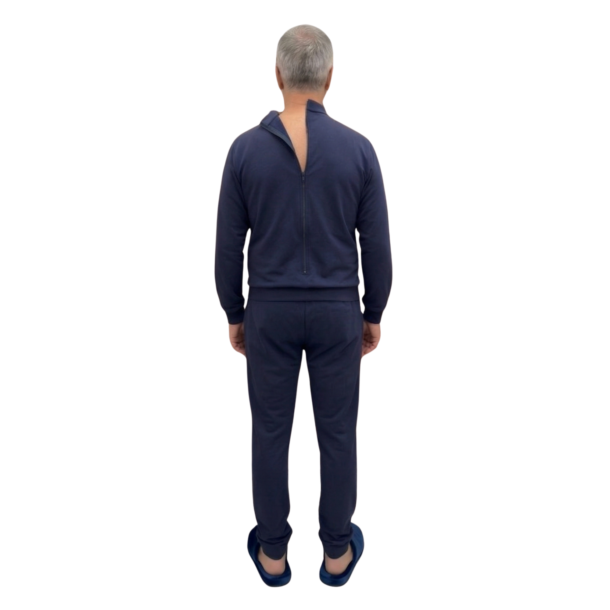 The suit is equipped with a back zip that allows it to be opened without accidental removal by the elderly patient or those suffering from mental illnesses such as Alzheimer's/Dementia.