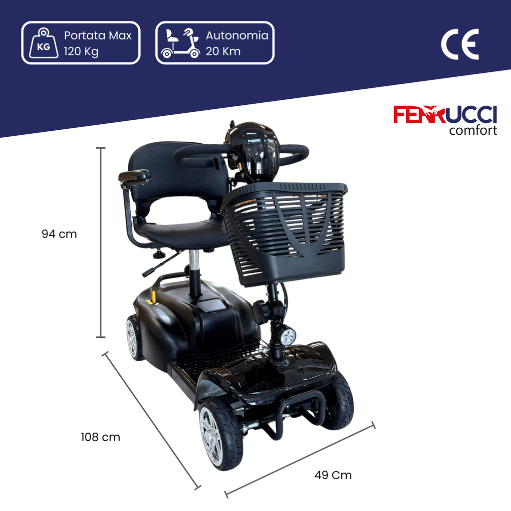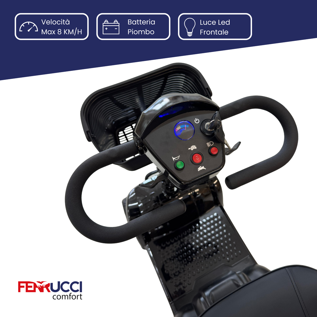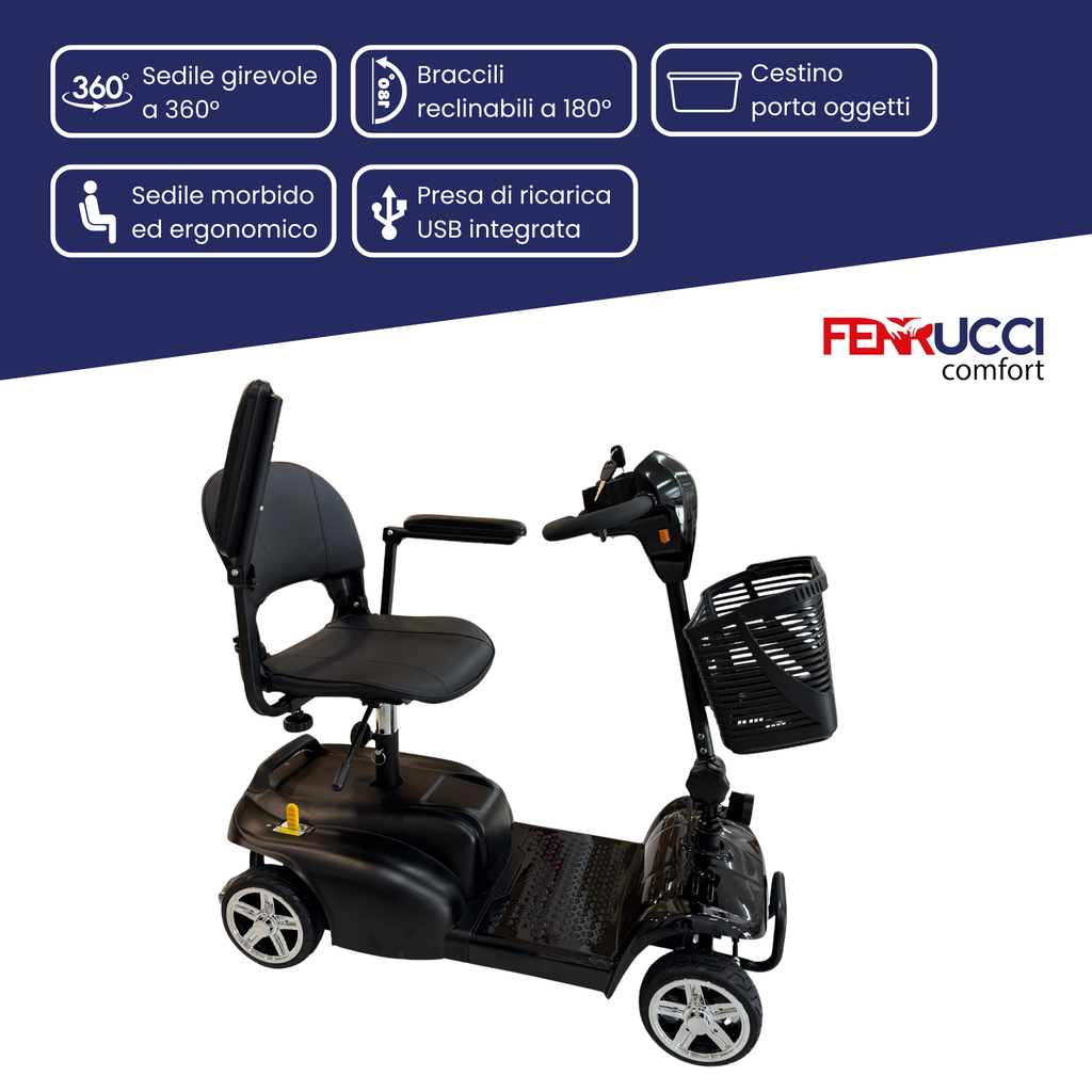 Riconquistare autonomia è più semplice quando il mezzo è davvero pensato per chi lo usa ogni giorno. Lo scooter elettrico Ferrucci Comfort per anziani e persone con mobilità ridotta unisce comfort, sicurezza e praticità in un design compatto, ideale per città, parchi e centri commerciali. Classificato come Dispositivo Medico Classe 1 con IVA agevolata al 4%.