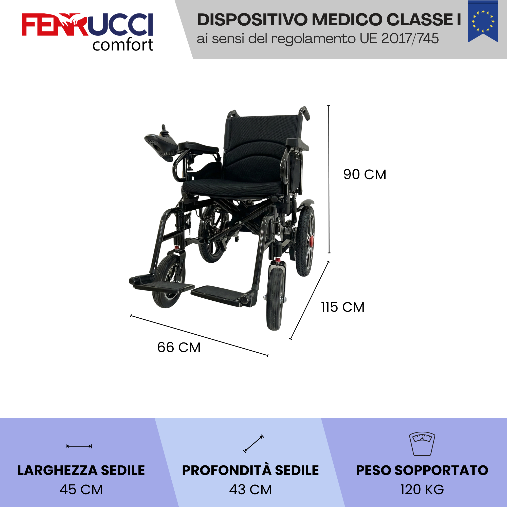 Comfort e Sicurezza Certificata: Dispositivo Medico con garanzia del fabbricante di 1 anno. Sopporta una capacità di carico massima di 120 kg. La seduta (45 cm x 43 cm) e i pedali semi-modulari assicurano una postura comoda e personalizzabile.
